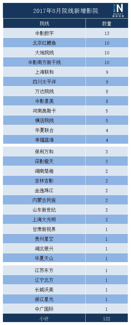8月院线新增影城有122家,中影数字新增影院13家,大地、红鲤鱼与中影新干线新增影院都达到了10家。在过去三个月中,万达院线成为新增影院数最多的院线,达到了37家;大地院线则紧随其后,在过去3个月新增了36家影院;而第3名则是北京红鲤鱼院线,新增32家。中影旗下的中国数字、中影南方新干线以及中影星美虽然单院线新增影院数未进前三,但是三家加起来的新增影院足足有87家——中影系的院线, 还是值得竞争对手忧虑的。