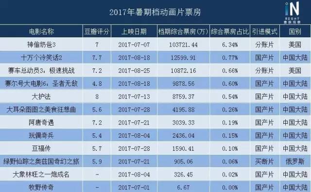 除了爱情、喜剧、惊悚片,这个暑期档的动画电影表现也较为一般。暑期档动画电影上映12部,总票房近16亿,票房占比近10%。然而如果除去拿下超过十多亿票房的《神偷奶爸3》等海外动画片,从国产动画电影角度来看,表现可以说非常惨淡了:9部国产动画片,票房仅为4.3亿。