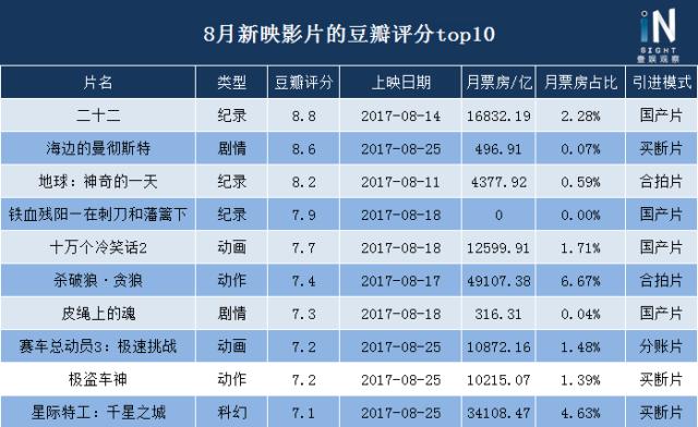 虽然众多类型片都在这个暑期档扑街了,但是这个暑期档仍然浮现了一大批高评分影片。比如说《二十二》、《海边的曼彻斯特》、《大护法》、《地球:神奇的一天》、《摇摇晃晃的人间》等等,在豆瓣的评分都超过了8分,而即便是《战狼2》、《杀破狼·贪狼》、《极盗车神》等商业大片,评分也超过了7分:可以说这是中国影迷有史以来最幸福的一个夏天了。