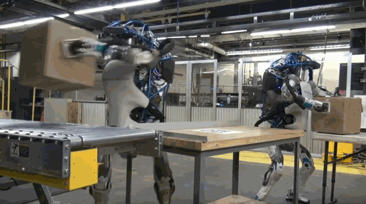 波士顿动力公司还设计了第三代人形机器人Atlas。一般来说,机器人举起箱子放到传送带,类似的任务,要比人类慢三分之一。Atlas搬运箱子的过程中也在迈步走,同时体现了动态平衡、动态抓取和动态感知这三个标准。