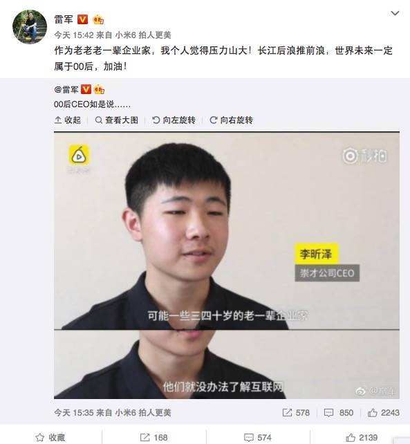 就连雷军这样的早已财务自由、创办了庞大的小米商业帝国,位居福布斯中国富豪排行榜前12的企业家,也表示压力山大,在微博点评这位00后企业家的微博: