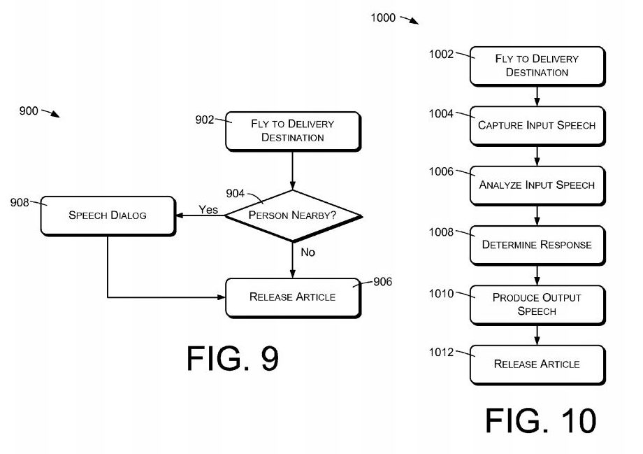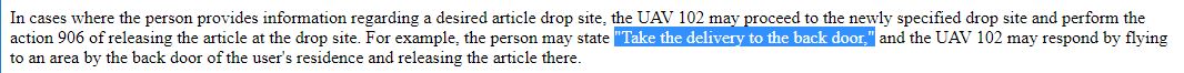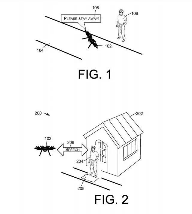 无人机率先发声,可设想的场景是实物占据其航行路线,这时它会发出警告,如“请远离我”(用户还能通过语音输入,设置相对委婉的提醒),提醒周遭注意。另外,亚马逊专利指出,当用户传达指令,甚至如“把货物放在后门”这种相对模糊的表述,无人机能识别,并放到对应位置。