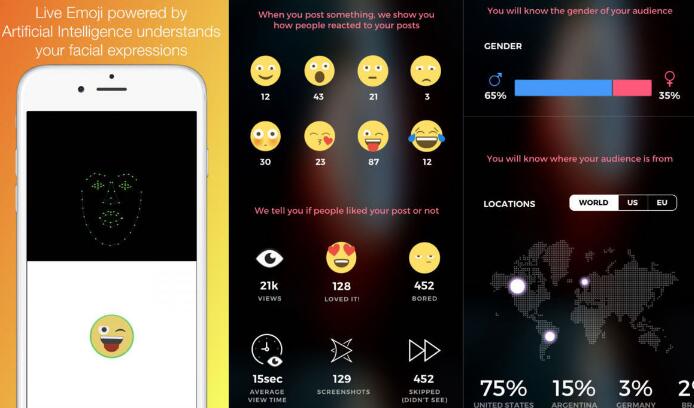 一款名叫 Polygram 的社交应用,就这样应运而生。Polygram 是一款集发布照片、视频和信息为一体的社交软件,目前仅支持苹果手机免费下载。它利用人工智能技术捕捉人的面部表情,并将其实时转化为 emoji 表情。