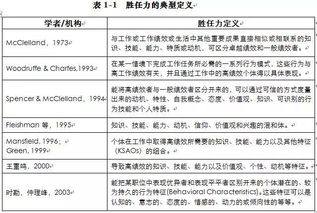 自麦克里兰(McClelland,1973)提出胜任力概念后,出现了大量有关研究,研究者们纷纷对胜任力进行了界定,表1-1列举了一些比较典型的胜任力定义:
