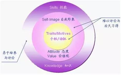 在这一模型中,博亚特兹把胜任力由内到外概括为层层包裹的结构,最核心的是动机,然后向外依次展开为个性、自我形象与价值观、社会角色、态度、知识、技能。越向外层,越易于培养和评价;越向内层,越难以评价和习得。