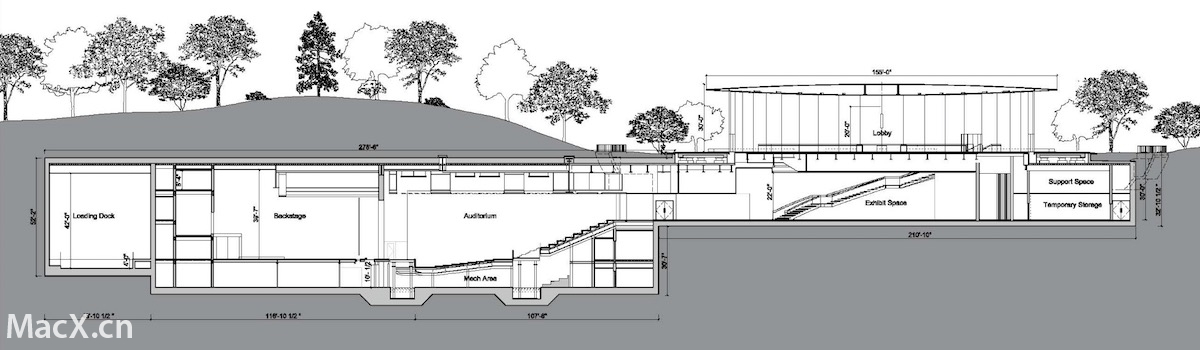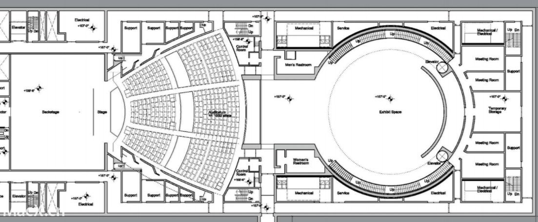 史蒂夫乔布斯剧院位于 Apple Park 园区的一处制高点,建那么高不仅是因为在那里可以俯瞰整个园区,同时也是为了隐藏其位于地下的四层建筑。媒体代表竟会从玻璃入口进入,然后沿着两侧的弧形旋转电梯下到剧院,而两侧的旋转电梯的方向不同,一个下楼,一个上楼。这样人群就可以从一个大门进出。