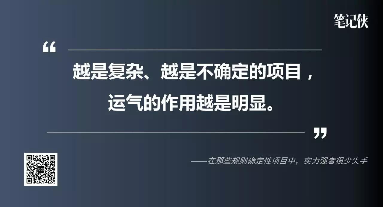 在那些规则确定性项目中,实力强者很少失手,而越是复杂、越是不确定的项目,运气的作用越是明显。