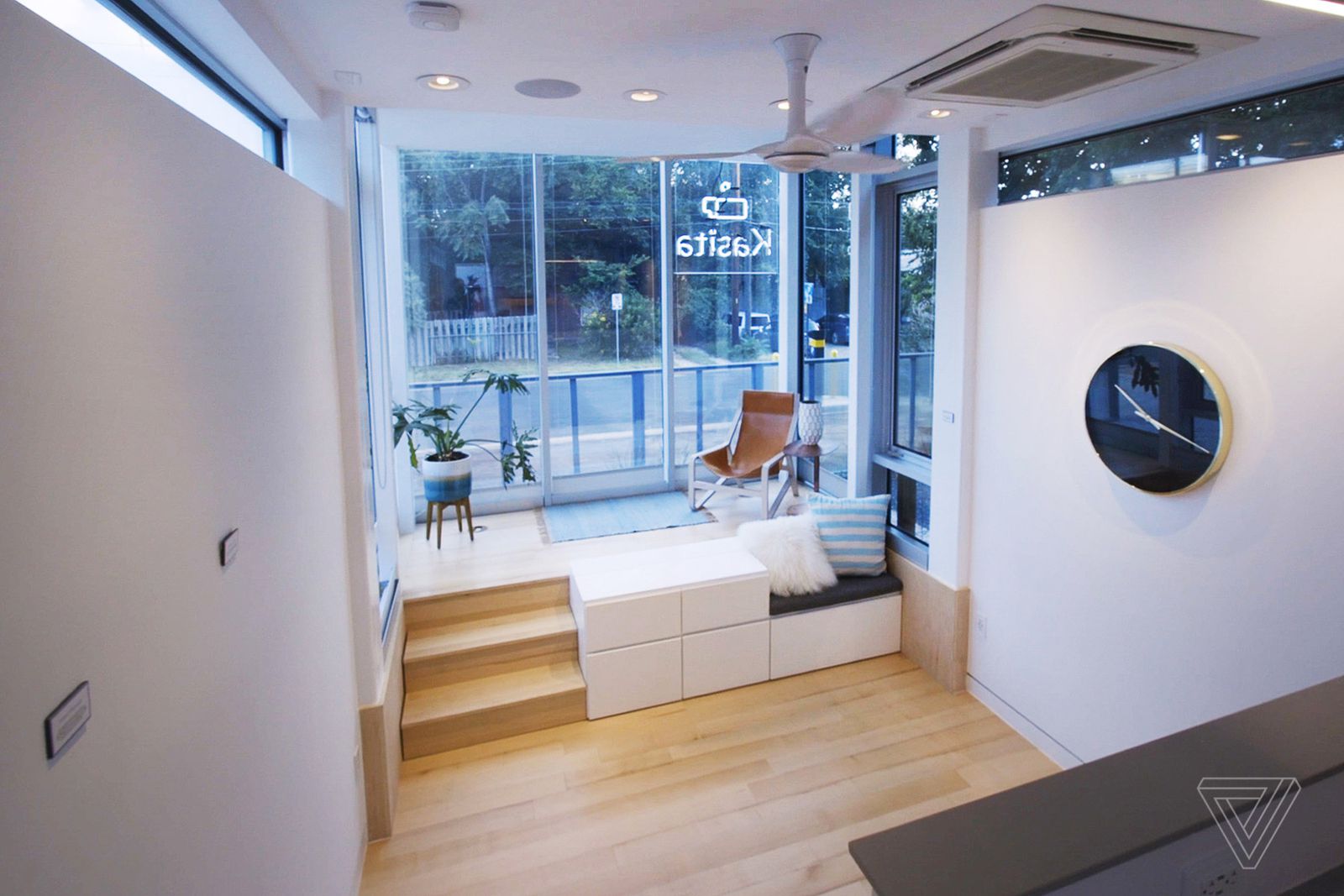 从the Verge拍摄的视频来看, Kasita不到40平米的空间里塞下了传统住房有的诸多基本设施——浴室、厨房、书房、卧室等。并且屋内还有如下高能的配置:鸟巢温控器、亚马逊 Echo、由SageGlass制造的特殊玻璃(这种玻璃能根据室外阳光强度来遮阴,无需窗帘)以及飞利浦调色灯光(使用者能自由控制灯光的颜色和强度)等。