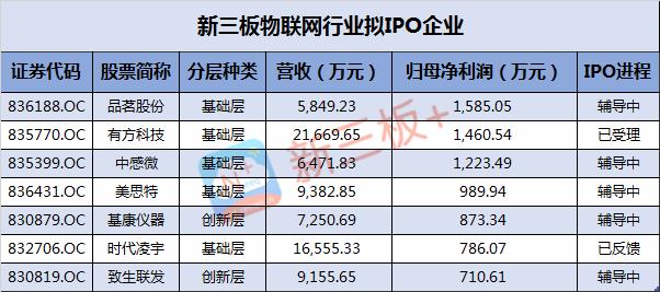 目前新三板拟IPO的企业有573家。在物联网板块,有方科技和时代凌宇正在排队,另外有品茗股份、中感微、基康仪器、致生联发和美思特发布了上市辅导公告。