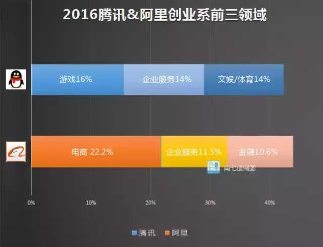 金融成为共同热门领域:根据南极圈提供的数据,其收录统计的233个腾讯系创业中,创业涉及的领域比较广泛,但主要是集中在游戏(16%)、企业服务(14%)、文娱/体育(14%)、互联网金融(12%),有个特别要注意的数据是,社交独霸天下的腾讯,它的离职员工在这个领域的创业者只占3%,一是面临着腾讯QQ、微信强大的社交攻势和压力,另外一个就是社交离钱太远了。要做大很难。而根据阿里创业组织前橙会提供的资料,阿里系创业前三领域分别是电商(22.2%)、企业服务(11.5%)、金融(10.6%)。