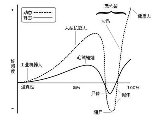 机器人的研发过程中多数会遇到「恐怖谷效应」,人形机器人的相似度与人类的好感度不成正比,随着物体拟人程度增加,人类的反应呈增-减-增曲线,当拟人度达到某一程度时,人类好感度会大幅下降,甚至还会觉得拟人物惊悚可怕。而 Facebook 研发的可以表达情绪的机器人让我们距离攻克这个障碍又近了一步。