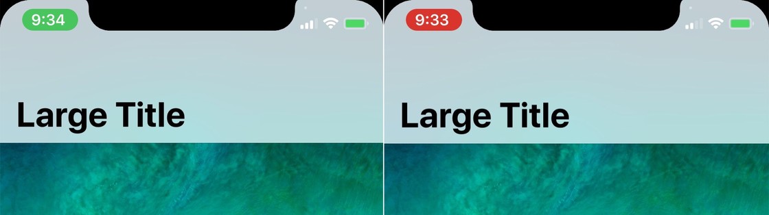 Twitter 用户 @stroughtonsmith 也进一步展示了状态栏的更多样式。接听电话或录屏时时,新 iPhone 不会像现在一样,整个状态栏顶部都变色,而是左侧的时间会加上一层绿色或红色底。