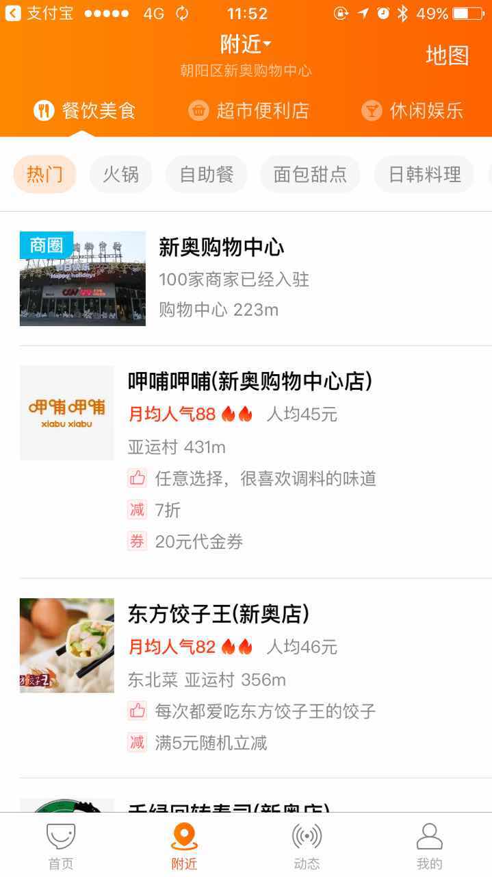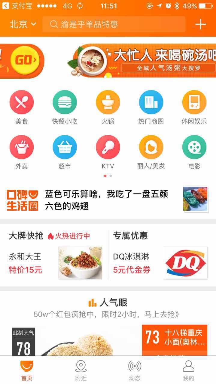 独立口碑App包括“首页”、“附近”、“动态”、“我的”四个功能页,基本沿袭以往支付宝里的主要功能,如吃喝玩乐店铺、人气眼、人气值、查找无地沟油商家等。不过,功能体验方面相较此前有所优化。用户依旧能用独立口碑App来抢优惠、预约餐厅、扫码点餐和付款。
