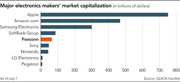 自年初到今年7月,富士康的股价已经上涨了40%,接近120新台币一股。从公司市值来看,富士康的市值已经达到20万亿新台币(约660亿美元),比索尼和任天堂的市值还高。