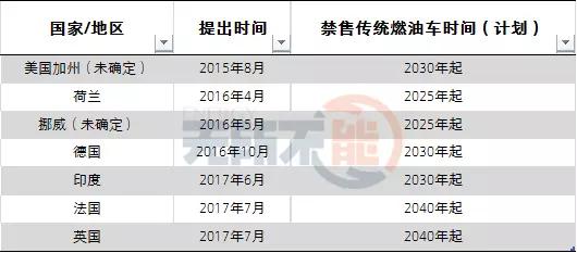 我们看一下其它国家、地区禁售燃油汽车时间表: