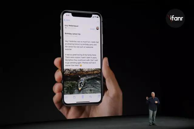 在短暂的演示过程中,我们也看到了系统和应用对 iPhone X 屏幕的适配情况,可以看到系统的内置 app 都尽可能地利用到了全面屏上方的两个区域,而在观赏照片、视频时也会全屏显示,只是中间的 “刘海” 会遮挡部分内容。