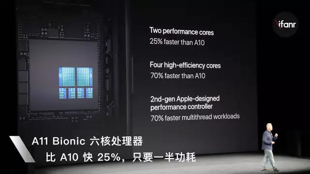神经网络引擎:作为每次发布会的送分题,iPhone X 的 A11 芯片相对前作又有了绝对性的提升,制程工艺仍然是目前业界最先进的 10nm 的水平,A11 采用了 4 个能效核心 + 2 个性能核心的搭配组合,其中能效核心相对 A10 提升 70%,性能核心提升 25% 的性能。