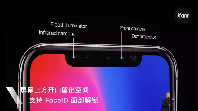 异形全面屏:传言已久的 “刘海” 之下,掩盖不住的是 iPhone X 的炫彩屏幕。除去屏幕上方的一众传感器区域之外,整机正面的所有区域都是屏幕。