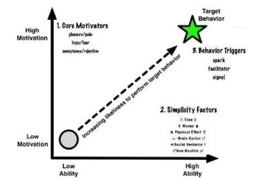 BJ Fogg(BJ Fogg 斯坦福大学教授,他致力于研究说服式(persuasion)的技术,了解人类的行为特点,创造习惯等)提出了一个新的理解人类行为的模型,他称之为Fogg behavior model (FBM),在这个模型中,他认为一个行为包含以下三个维度,动机,能力和促发点(triggers),为了实施某个行为,个体必须同时具备: