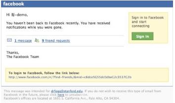 这里有一个例子:因为我没有使用我的“BJ-Demo”Facebook帐户,所以Facebook自动发送这个触发器来实现他们的目标行为-登录Facebook(备注:“BJ-Demo”是本人注册的一个测试账号,长时间没有登录使用);注意这种特定的行为,登录是Facebook更大目标的第一步:让我参与到Facebook。