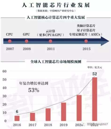 根据中国产业发展研究网的报告,2016年人工智能芯片市场规模达到6亿美金,预计到2021年将达到52亿美金,年复合增长率达到53%。人工智能芯片市场增长迅猛,发展空间巨大。