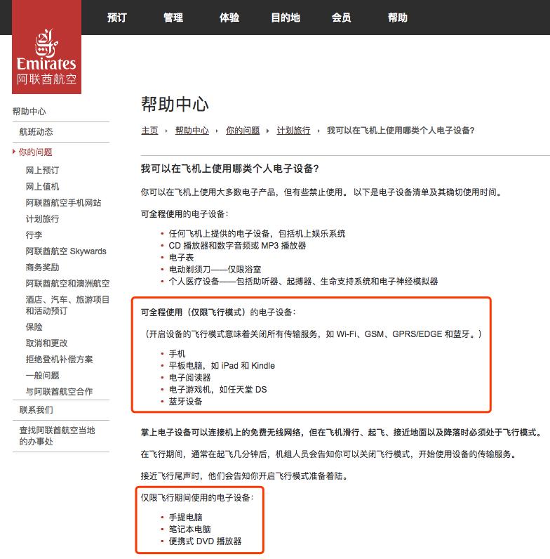 阿联酋航空允许乘客全程使用手机(但需要打开飞行模式),允许在平飞期间使用电脑连接 WiFi;