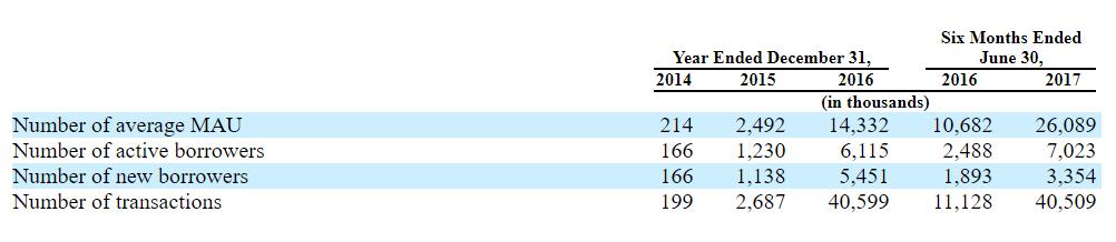 用户情况方面,根据招股书,截至2017年年中,趣店集团注册用户数约4790万,平均月度活跃用户数达2890.6万人,2017年第二季度实际交易用户数558.8万人。截至2017年6月30日的12个月中,交易额超过600亿元人民币,交易笔数接近7千万笔。