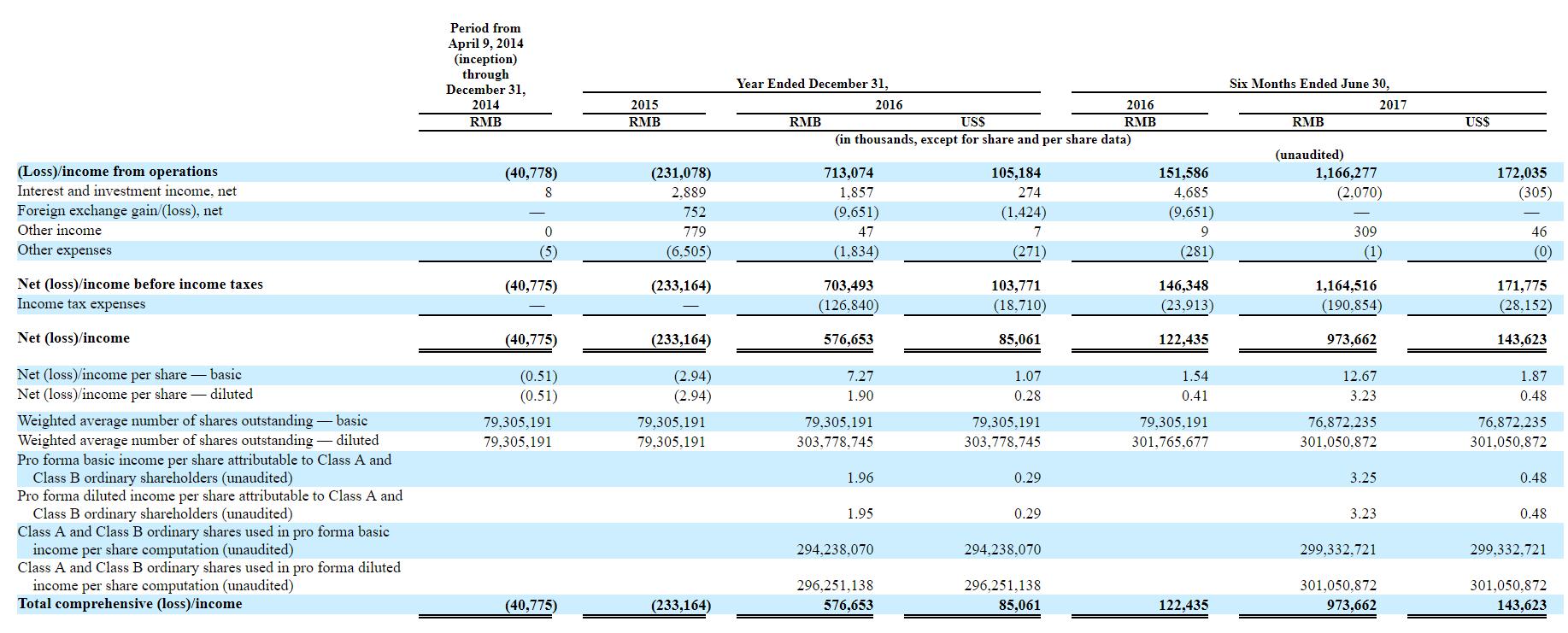 利润方面,趣店在2014年和2015年都是亏损,2014年4月9日到年底的亏损为4077万人民币,2015年净亏损2.3亿元。去年开始扭亏为盈,全年净利润为人民币5.767亿元(约合8510万美元)。