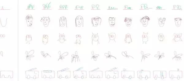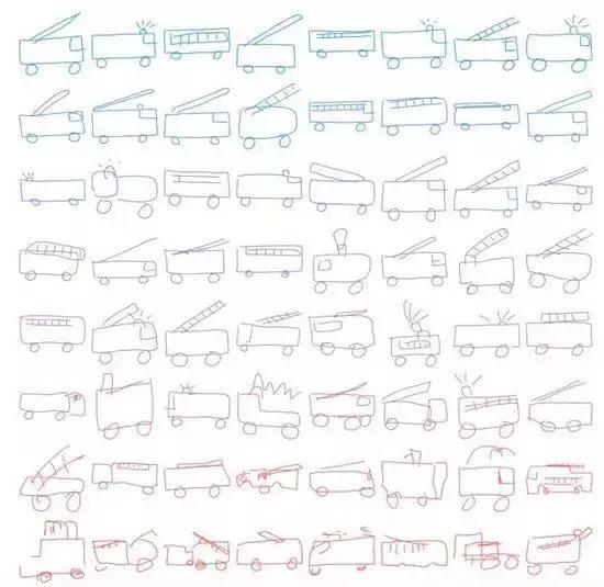 和上图一样,同样是汽车,颜色越偏暖的图案,代表随机性越大,而这些全都是SketchRNN的作品。