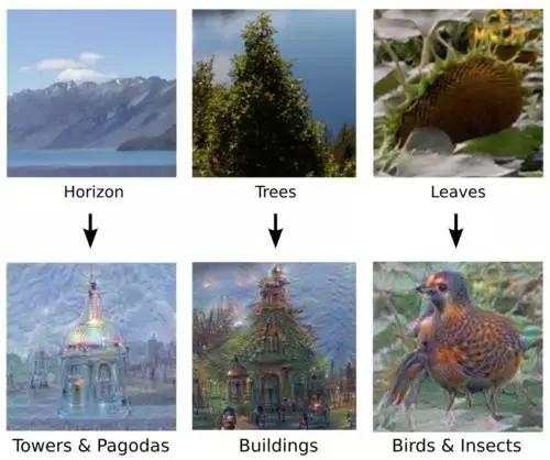 和上图一样,如果让我们把树看成建筑,把植物看成鸟,恐怕只能去发挥想象力了。这种机器识别出人眼不能识别的图案的情况,让我们再一次开始思考机器视觉和人类视觉的不同。或许,DeepDream真的是一个有着无限想象力的婴儿人工智能,把人类世界里的一切都看做它可爱的宠物狗。