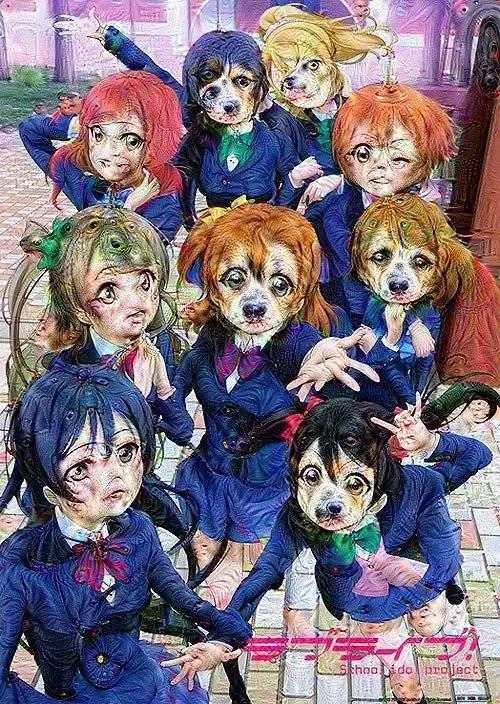 不知道是不是在训练是被喂了太多眼睛和小狗的图案,反正经过DeepDream加工过的图片基本都是这样……