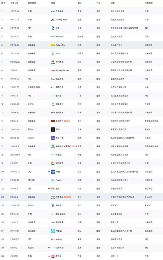截止目前,蚂蚁金服一共投资、并购了60家初创公司,其中金融领域33家。