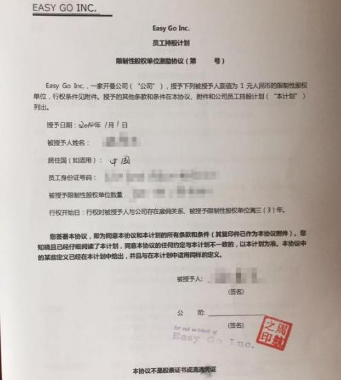 由于易到属于VIE架构,由境外离岸公司通过协议的方式控制境内的业务实体,因此与员工签署股权协议的公司是注册于开曼群岛的Easy Go Inc.。VIE架构的企业,员工维权会额外困难。