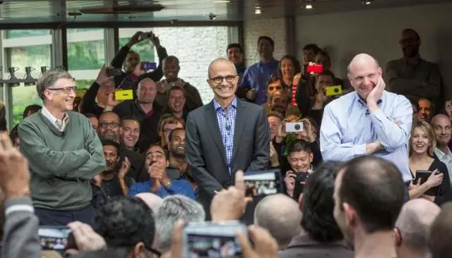 从左到右依此是:比尔·盖茨、萨提亚·纳德拉和史蒂夫·鲍尔默