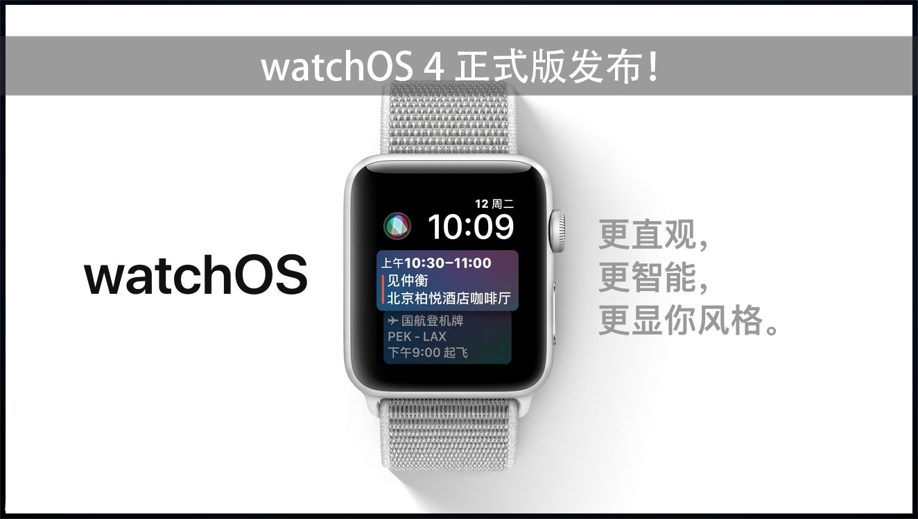 经过长达 3 个多月的测试,苹果今天发布了 iOS 11、watchOS 4 和 tvOS 11 正式版。watchOS 是专门为 Apple Watch 设计的操作系统,而 watchOS 4 为 Apple Watch 带来了很多新功能,包括全新的表盘以及更好的工具,让您更喜欢运动。 watchOS 4 可以通过 iPhone 上的 Watch 应用下载和更新。安装 watchOS 4 时,Apple Watch 必须拥有50%以上电量,并且需要连接充电器,放在 iPhone 附近。