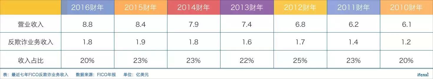 如上图,反欺诈收入在FICO营收中占比一直比较稳定,最近七年FICO反欺诈收入总体呈上升趋势,由此可判断,银行、保险等金融机构对于反欺诈需求长期、稳定存在。目前,FICO在反欺诈领域要同Acxiom、Epsilon、SAS等机构竞争。