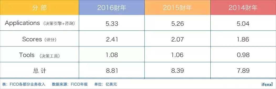 从2016财年收入看,FICO评分贡献2.41亿美元收入,占其总收入27%。决策引擎、专家咨询部分收入达5.33亿美元,占总收入60%,营收占比最高。决策工具在其业务体系中作用较低,收入占比仅为12%。