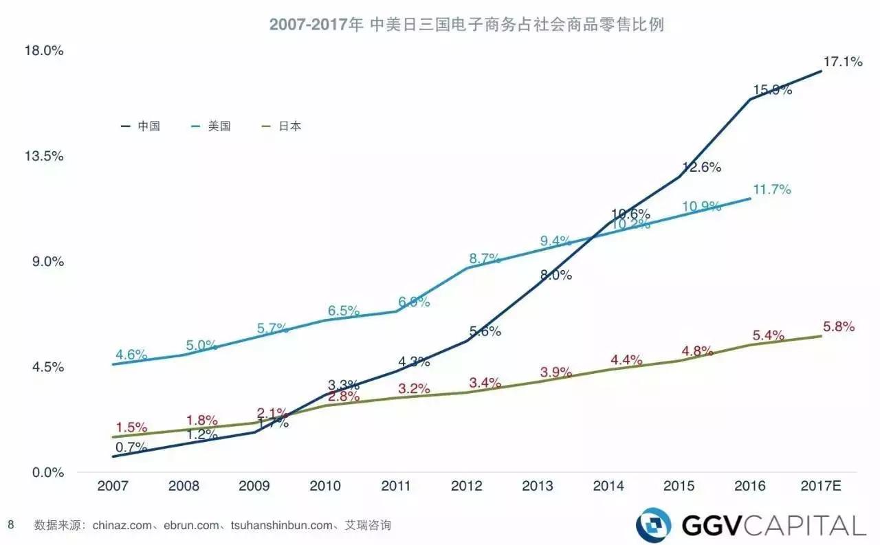 一开始淘宝时要等几周才会拿到货,但时间久了整个服务的品质不断地提升了,到现在当天都可以拿到货了。2005年中国电商的渗透率不到1%,而现在有17%左右,造就了一个万亿美元的巨大市场。