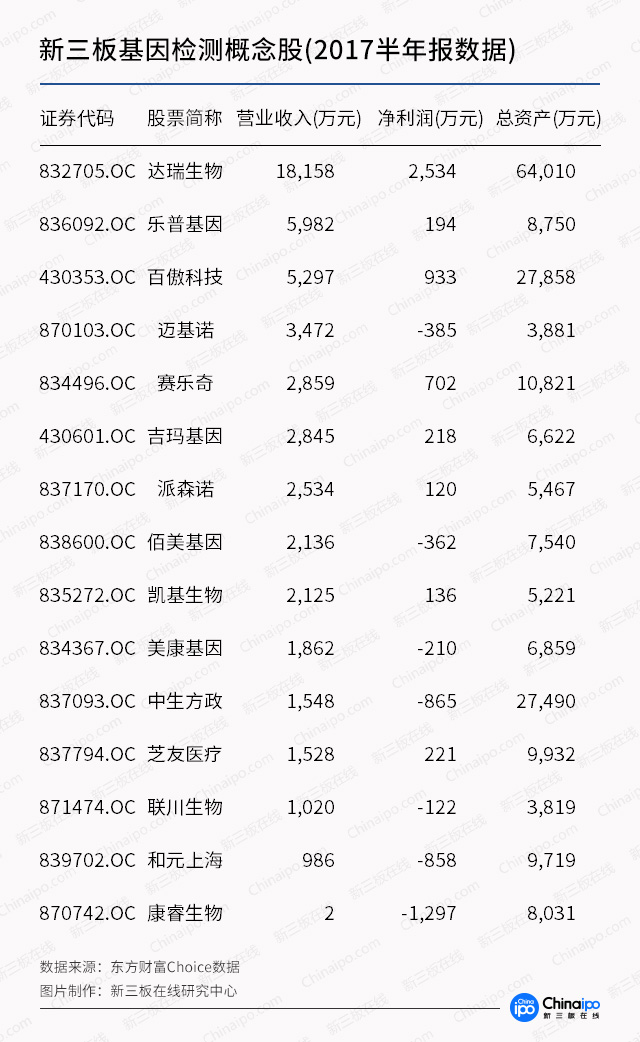 目前新三板上直接与基因检测相关的企业共有15家,其中8家盈利、7家亏损。如果按照营收排名,2017半年报数据显示,营收大于5,000万元的企业共有3家,分别是达瑞生物、乐普基因和百傲科技。