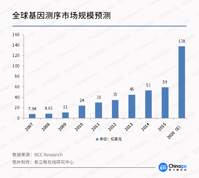 同时,根据研究机构BCC Research的统计,近几年来基因测序市场飞速发展,从2007年的7.94亿美元增长到2015年的59亿美元,预计未来几年依旧会保持快速增长,2020年将达到138亿美元,年复合增长率为 18.7%。