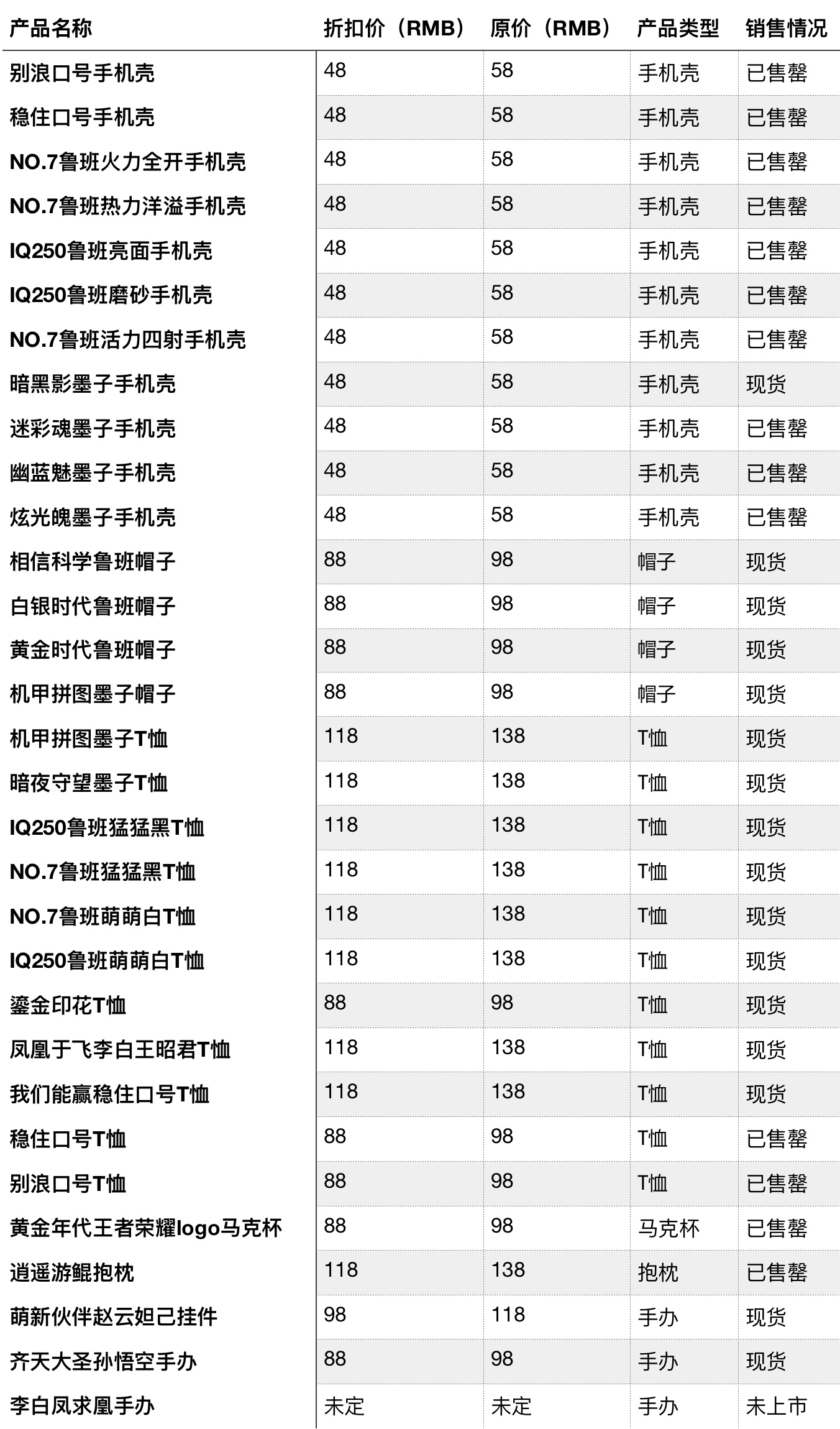 总体来说,此次《王者荣耀》周边商城在试运营期间销售的周边SKU并不多,我们将其周边产品信息做了简单统计,结果如下表(销售信息截止至9月20日16点):