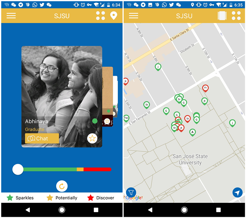最左边的产品展示图是校内社交的主界面,学生可以左右滑动,寻找你感兴趣的同学。下方的滑轴从最左边的绿色到最右的红色代表了与你性格最匹配到最不匹配的同学,右边则是基于LBS的定位图,Ganesh说当用户与你最匹配的陌生校友接近到一定距离时,双方的手机会唤醒并震动,以提醒用户有一个与你很Match的同学正在你身边。