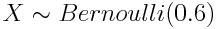 上式表示随机变量 X 服从成功率(正面向上)为 0.6 的伯努利分布。