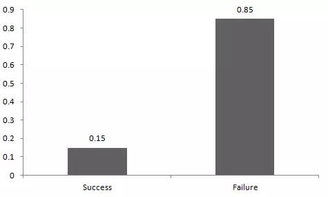 如上图所示,我的成功概率=0.15,失败概率=0.85。期望值是指一个概率分布的平均值,对于随机变量 X,对应的期望值为:E(X) = 1*p + 0*(1-p) = p,而方差为 V(X) = E(X^2) – [E(X)]^2 = p – p^2 = p(1-p)