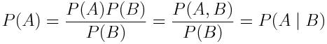如果我们从右到左阅读上式,我们会发现 P(A | B) = P(A)。这就意味着事件 A 独立于事件 B!P(B)也是一样,独立事件的解释就是这样。