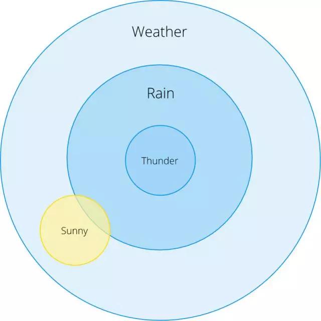 从这个欧拉图,我们可以看到 P(Rain | Thunder)= 1 :当我们看到雷声时,总会下雨(当然,这不完全正确,但是我们在这个例子中保证它成立)。