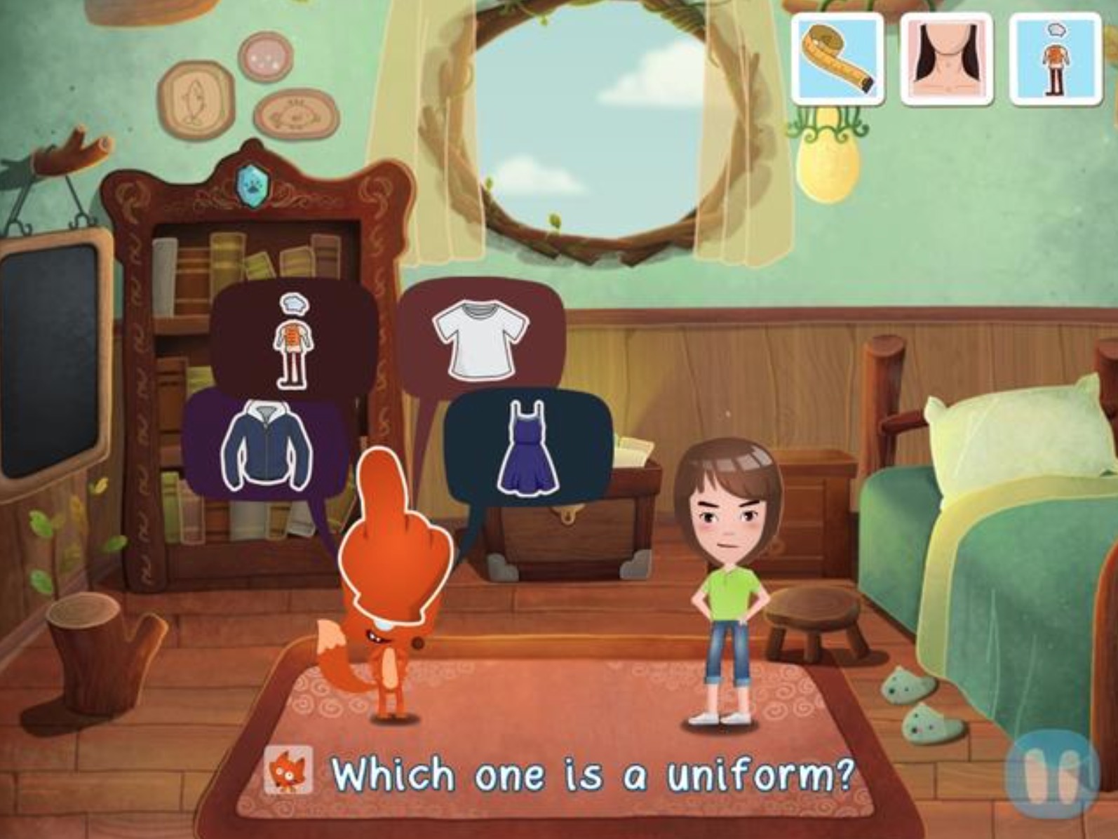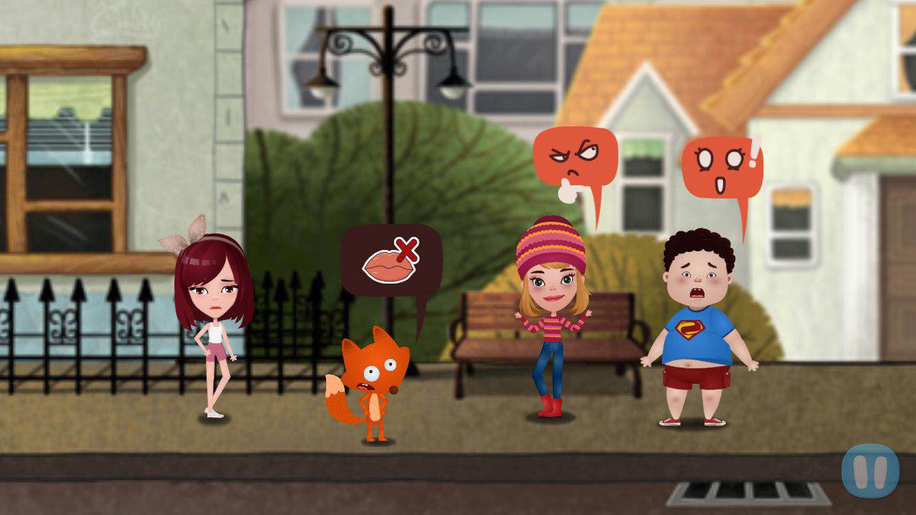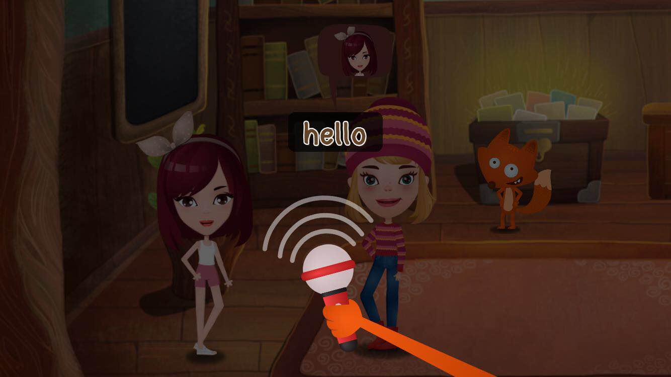 具体来讲,在一个小狐狸 Ben 帮主角(由用户扮演)寻找被兔子偷走的语言的主线故事中,儿童以“通关”的方式参与剧情,由于落脚点仍旧是英语学习,因此,在这一过程中也包含了“听”、“说”、“读(理解)”的三个环节,这些学习动作被嵌入到剧情推进中,例如,在某些情节中,需要在故事对话过程时,会由其他角色适时的引导儿童进行朗读发音,读音正确了才会进入新的剧情,不正确时则会提示进行重复修正。