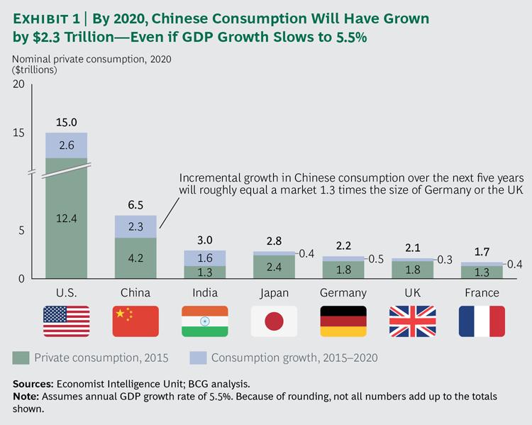 中国经济的确在经历着一场重大的结构性转变,消费的增长节奏也的确赶不上发展巅峰的时候。不过,尽管这种节奏有所放缓,但消费增长的未来轨迹依然是惊人的。哪怕GDP实际年增长率掉到5.5%,预计到2020年中国的消费者经济也将增长到65000亿美元。光是未来5年,其2.3万亿美元的增量就相当于今日德国或者英国市场的1.3倍。(参见图1)
