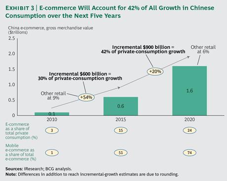 电子商务,尤其是移动电子商务将变革市场。研究表明,电子商务将会推动中国消费者购买不同类型的产品,且多样性也会极大丰富。预计到2020年跨境购物将占中国电子商务购物的15%。电子商务还将释放更多边远地区的购物潜力。