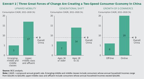 其关键发现是:一个“双速”的消费者经济正在中国涌现(参见图2)。高收入人群、年轻一代以及电子商务渠道均出现了高增长,但低收入、老龄消费者及传统零售渠道的消费增长则在减速。